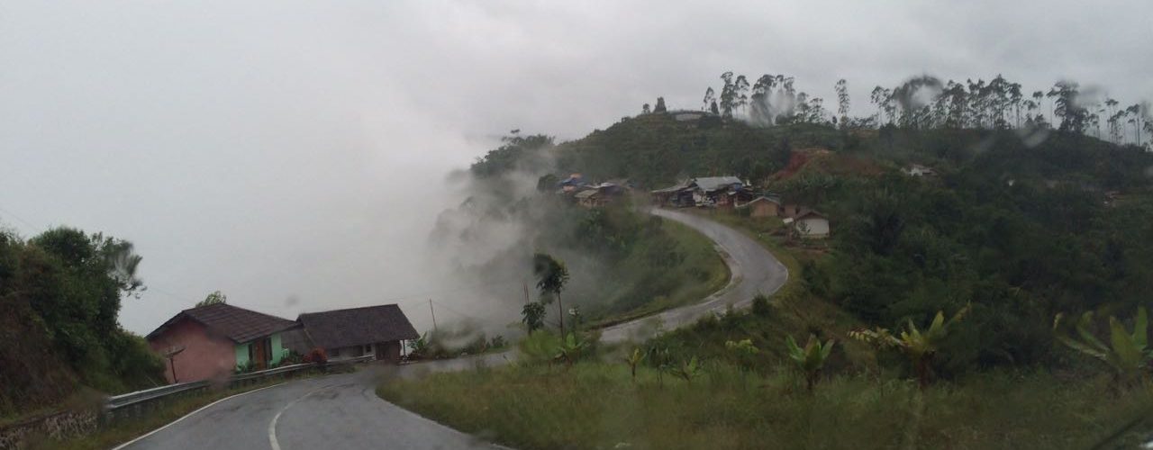 Berada pada elevasi 1600 meter di atas permukaan laut membuat kami disambut oleh hawa dingin yang menusuk hingga tulang. Kabut turun demikian tebalnya, disertai rintik hujan yang menambah suasana syahdu di tengah hamparan perkebunan teh nan membentang di kanan dan kiri jalan. Kami harus ekstra hati-hati untuk melewatinya karena jarak pandang tak lebih dari sepuluh meter saja.